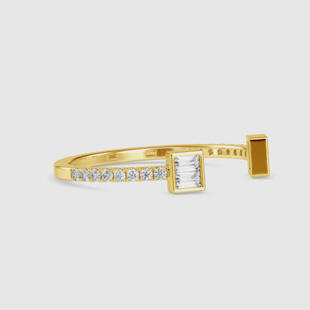A sleek and modern open cuff ring featuring two baguette-cut diamonds set on each end. The open design gives it a contemporary and adjustable fit, while the clean geometric styling adds a sharp, minimal aesthetic.